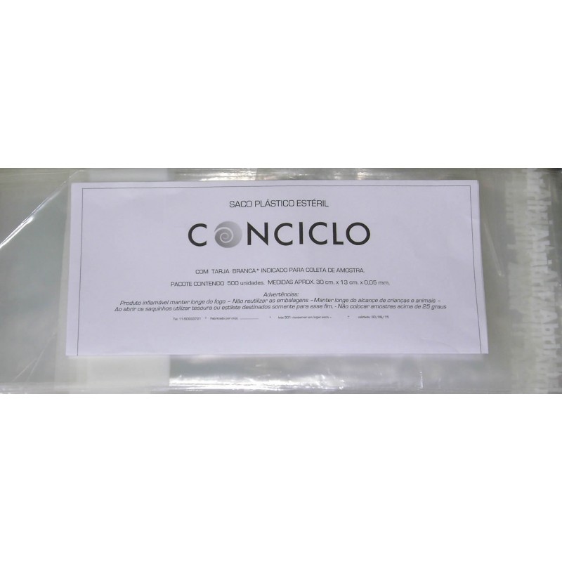 Saco estéril para coleta de amostra em plástico cristal transparente com tarja em branco